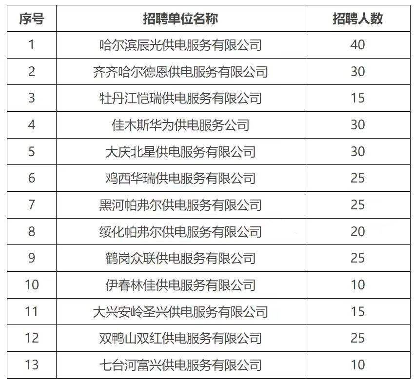 為進一步提高鄉村供電服務水平,結合供電服務公司發展需求,充實基層供電服務力量,黑龍江省各地供電服務公司組織開展2024年供電服務職工招聘工作,現將有關事項公告如下: